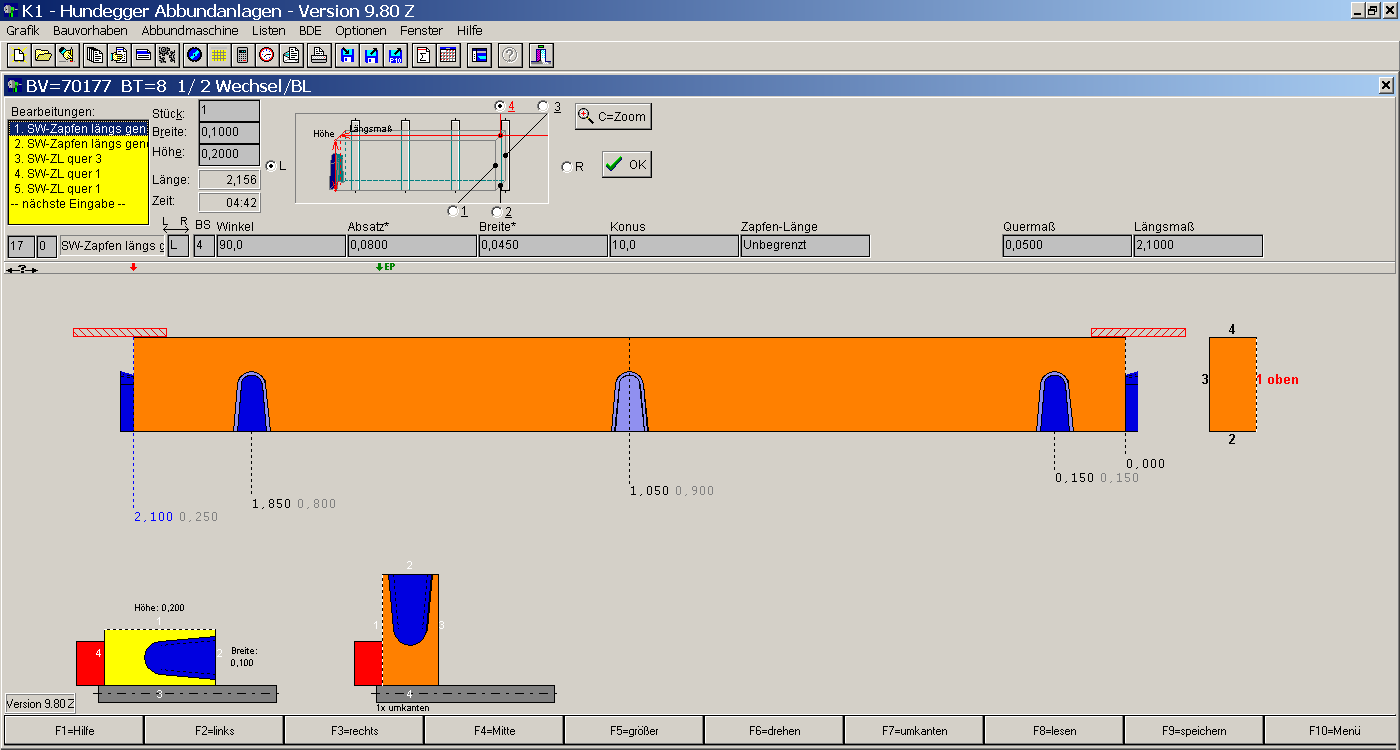 Zapfen und Zapfenlöcher in Wechsel - erzeugt mit ZIMMERER Version 6.213, angezeigt mit der Hundegger Einzelstabsoftware.