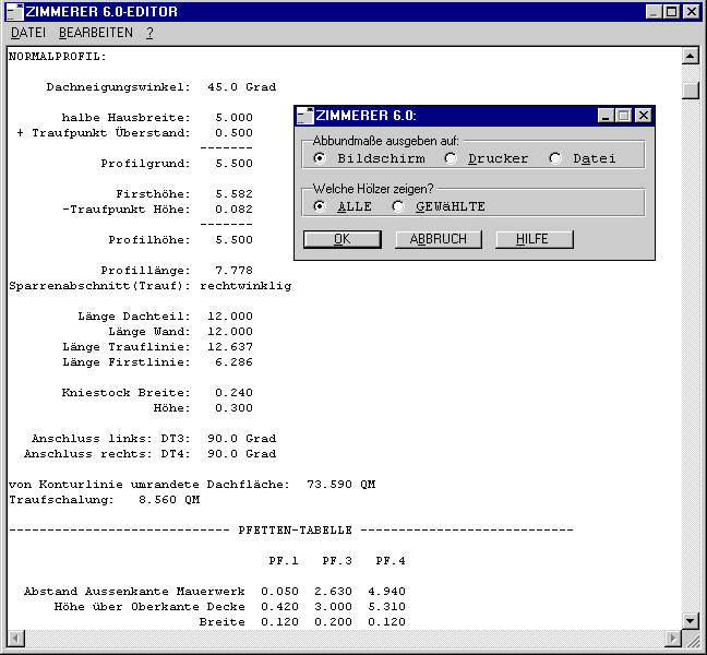 Die Ausgabe erfolgt wahlweise direkt auf den Drucker, in eine datei oder (wie in diesem beispiel gezeigt) in den ZIMMERER-Editor - hier ist vor dem Ausdruck noch eine beliebige manuelle Bearbeitung möglich.