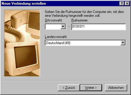 5. Geben Sie als Rufnummer die T-Online-Einwahl (0191011) ein und wählen Sie dann Weiter. |