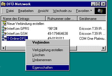 7. Drücken Sie dann im Fenster "DFÜ-Netzwerk" die RECHTE Maustaste über der neu angelegten Verbindung "T-Online-DFÜ" und wählen Sie "Eigenschaften". |