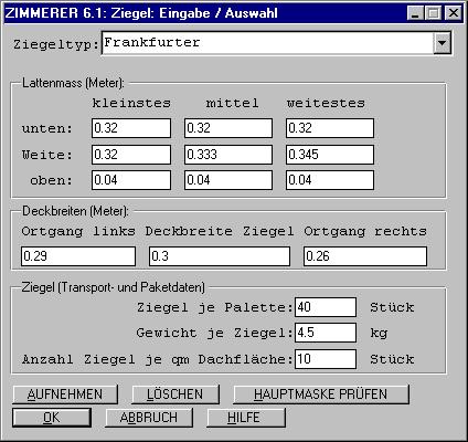 Bei Hauptdächern enthält die Hauptmaske jetzt neben den Lattenmaßen eine Taste ZIEGEL: damit wird eine neue ZIEGELMASKE geöffnet