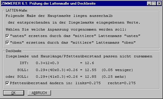 Mit HAUPTMASKE PRÜFEN und mit OK werden die in der Hauptmaske eingegeben Daten mit den gerade angezeigten Ziegeldaten überprüft, wobei mit OK zugleich die Ziegelmaske geschlossen wird (bei Wahl von ABBRUCH wird die Ziegelmaske ohne weitere Aktion geschlossen).